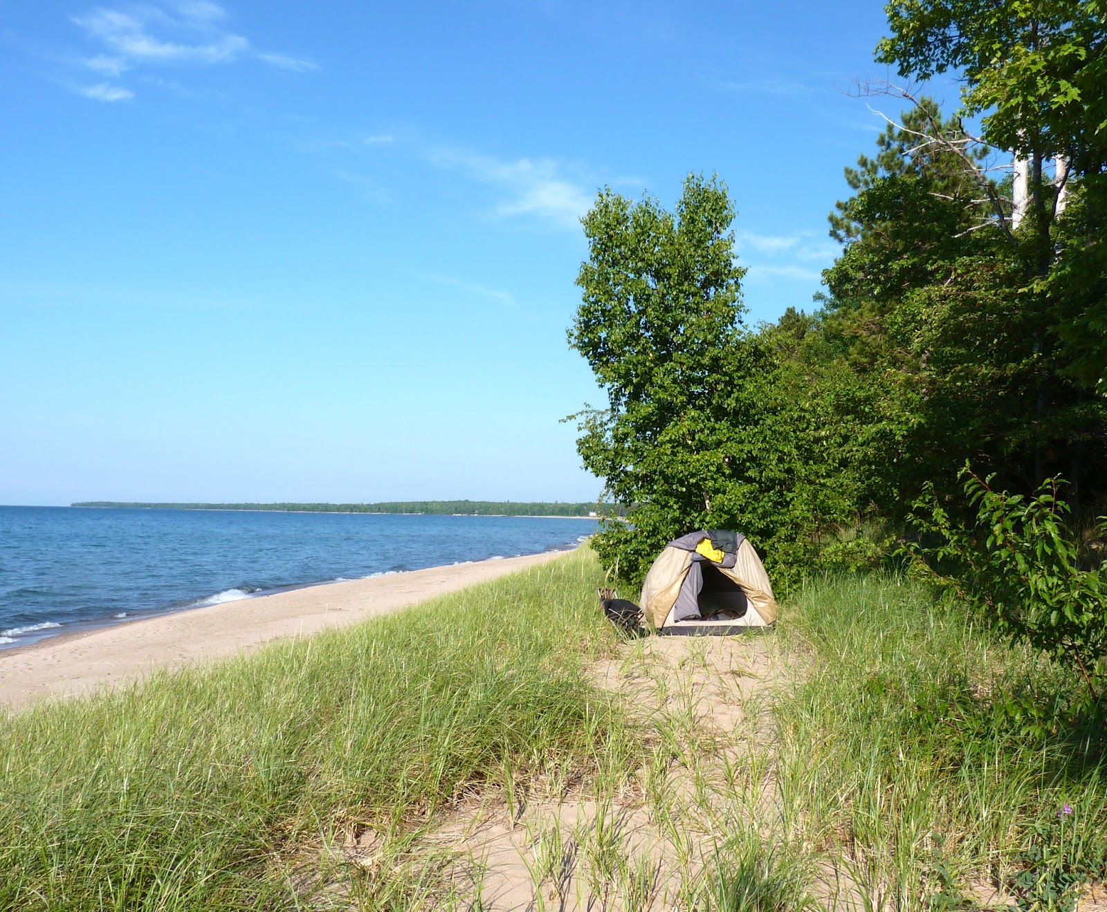 Mostly the road didn't run flush alongside Lake Superior, but sometimes it did. I was lucky one day, when on leaving the town of Marquette it looked like rain again. The sky cleared and it turned out to be a beautiful afternoon. I found a nice secluded spot on the shore of Lake Superior, and set up an early camp. I could have a wash in the chilly waters of the largest fresh water lake, and also rinse out my cycling gear.